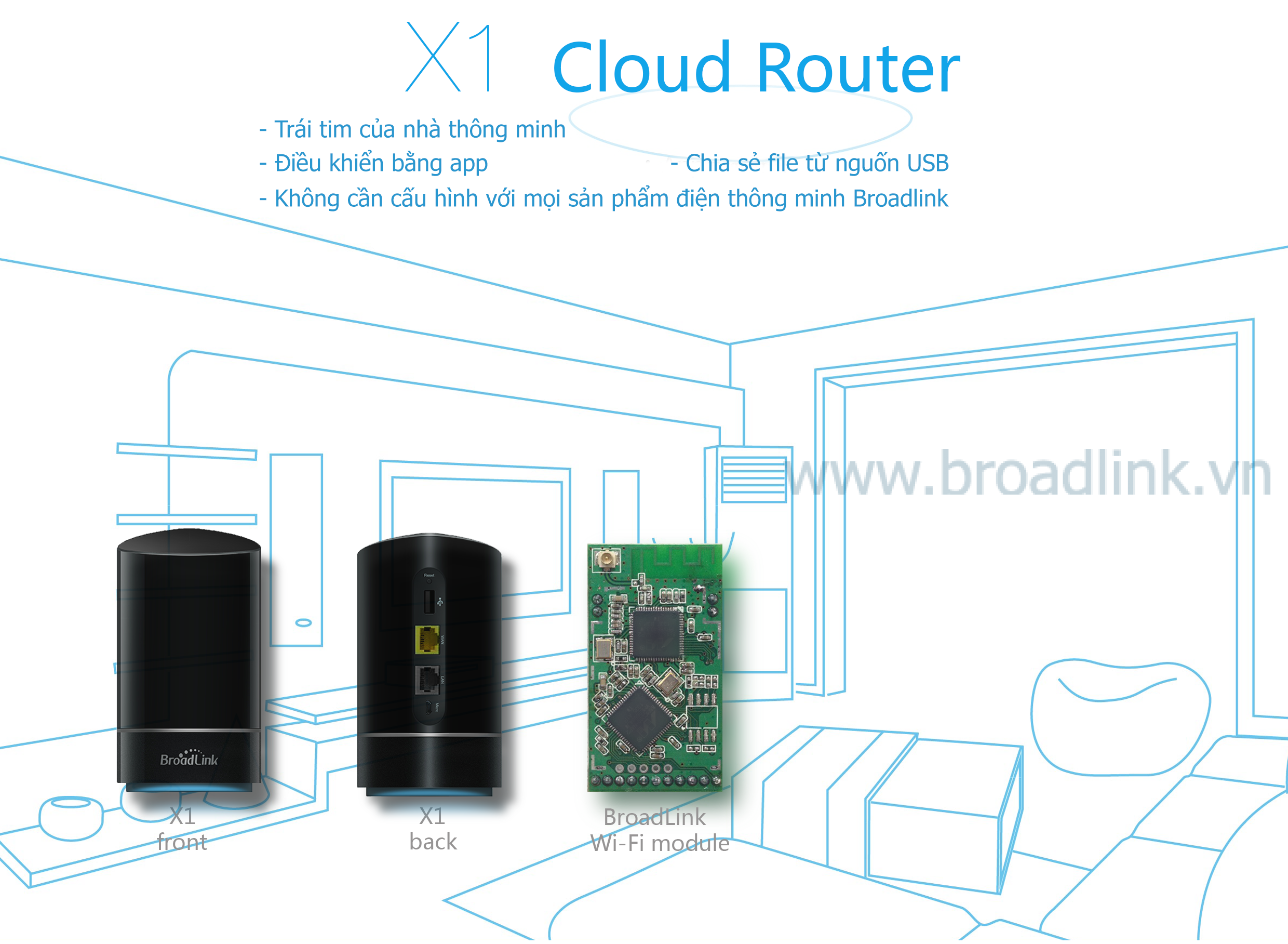 Dựa trên năng lực mạnh mẽ của chúng tôi trong việc R&D các module wifi hiệu quả cao ứng dụng vào hệ thống nhà thông minh, Cloud router Broadlink X1 sắp được ra mắt thị trường toàn cầu trong tương lai gần để bổ sung vào giải pháp nhà thông minh không dây tổng thể của Broadlink. Với công nghệ điện toán đám mây tiên tiến, Broadlink X1 mang tới một kết nối ổn định, tin cậy và trung tâm chia sẻ dữ liệu của bạn trong gia đình. Đặc biệt với các thiết bị điện thông minh Broadlink, Router này tự động đồng bộ để chúng hoạt động với nhau mà không phải cấu hình cài đặt gì thêm.